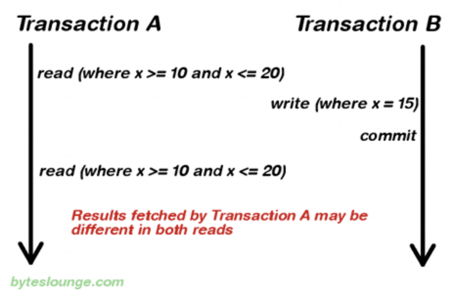 - 이때 Transaction B가 접근해 해당 조건의 데이터 일부를 삭제 또는 추가했을때, 아직 끝나지 않은 Transaction A이 다시 한번 해당 조건으로 데이터를 조회 하면 Transaction B에서 추가/삭제된 데이터가 함께 조회/누락 된다.