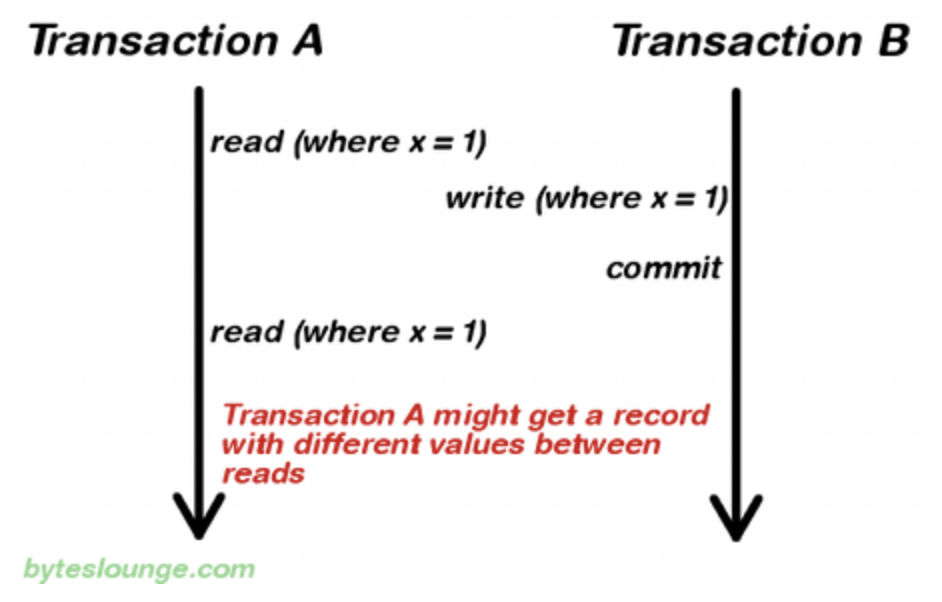 - 한 트랜잭션(Transaction A)이 데이터를 Read 하고 있다. 이때 다른 트랜잭션(Transaction B)가 데이터에 접근하여 값을 변경 또는 삭제하고 커밋하면 문제가 발생할 수 있다.