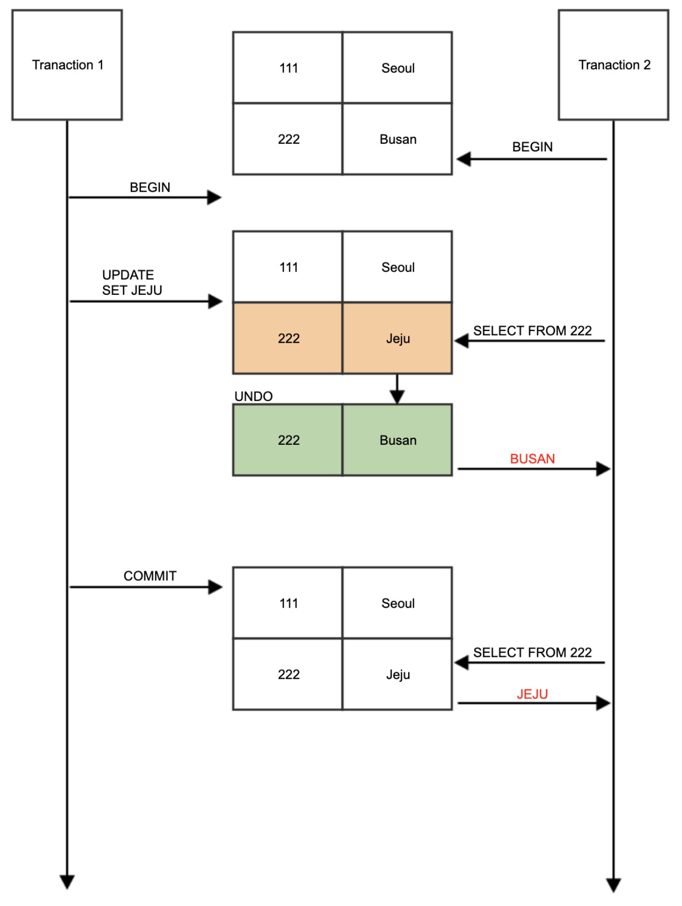 - 실제 테이블 값을 가져오는 것이 아니라 Undo 영역에 백업된 레코드에서 값을 가져온다. -> 커밋되기전 데이터를 가져온다.