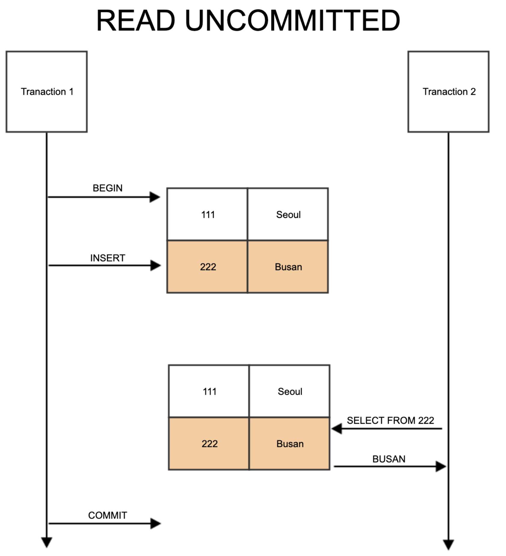 - 각 트랜잭션에서의 변경 내용이 COMMIT이나 ROLLBACK 여부에 상관 없이 다른 트랜잭션에서 값을 읽을 수 있다.