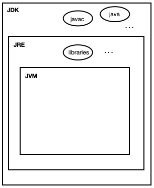 - java 는 컴파일한 후 바로 돌리는 compiled language 방식이 아니라, 자바가상머신으로 자신의 고유 환경을 구축한 후, 돌아가기 때문에 자바 컴파일러와 자바 가상 머신이 모두 필요하고, 이 둘을 묶어서 JDK 라고한다.