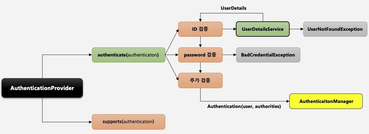 - AuthenticationProvider 는 사용자의 이름과 패스워드를 받아서 검증을 하는 클래스이다.