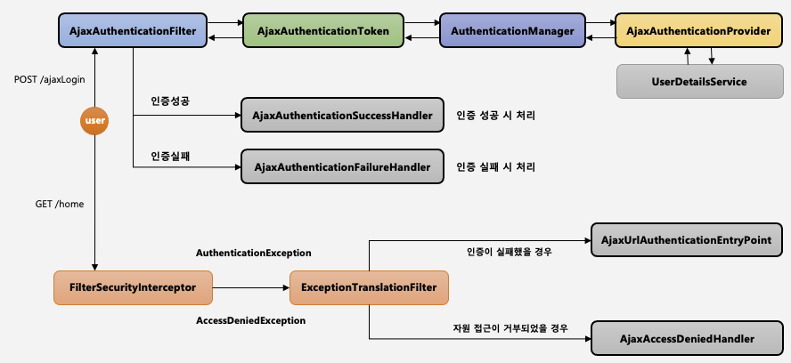 ajax 방식으로 구현하기 위해서 각각의 클래스 구현해 줘야 하지만, 방식은 폼인증 방식과 크게 다르지 않다.