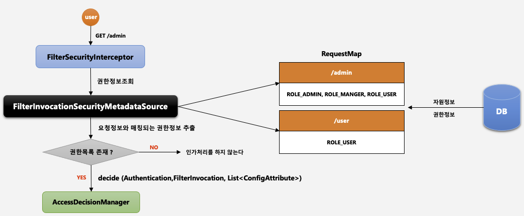 - 사용자에게 요청이 들어오면, FilterInvocationSecurityMetadataSource 에서 RequestMap 에 저장된 권한 정보를 불러와서 AccessDecisionManager 에게 전달해준다.
