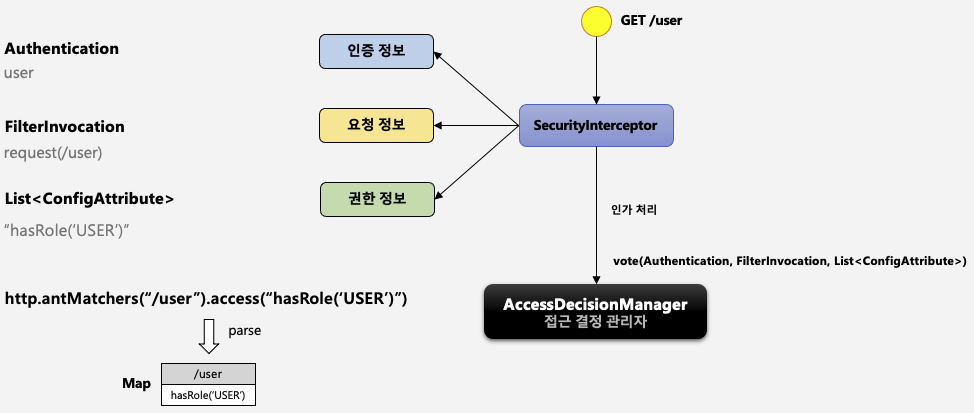 - 사용자에게 요청이 들어오면, FilterInvocationSecurityMetadataSource 에서 RequestMap 에 저장된 권한 정보를 불러와서 AccessDecisionManager 에게 전달해준다.