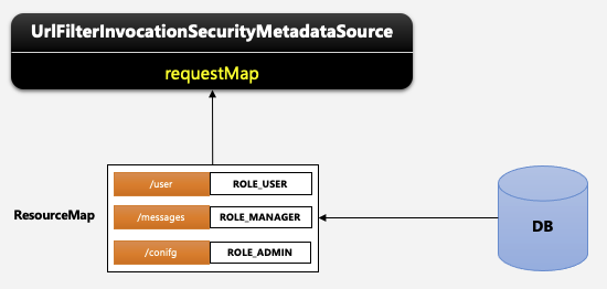 - DB로 부터 얻은 권한/자원 정보를 -> ResourceMap 으로 만들고, 빈으로 생성해서 UrlFilterInvocationSecurityMetadataSource 에 전달한다.