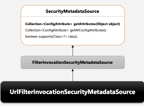 - SecurityMetadataSource 는 최상의 인터페이스 로써, getAttributes, getAllConfigAttributes, supports 메소드를 가지고있다. -> 이 메소드를 재정의 해줌으로써 커스텀할 수 있다.
