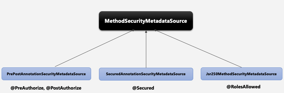 FilterSecurityInterceptor 는 FilterInvocationSecurityMetadataSource 에게 권한 정보를 요청하고, MethodSecurityInterceptor 의 경우엔 MethodSecurityMetadataSource 에게 권한 정보를 요청해서 반환 받는다.