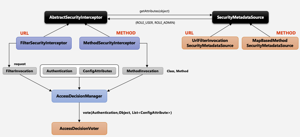 FilterSecurityInterceptor, MethodSecurityInterceptor 모두 AccessDecisionManager 에게 권한정보를 넘겨주는 것이 목적이다.
