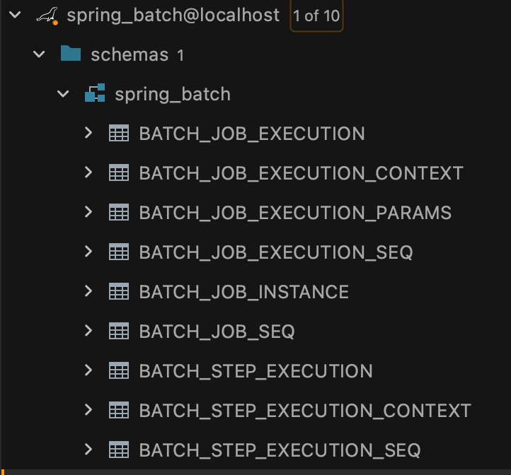 - Spring Batch Framework가 실행 시 meta data 테이블들을 사용하므로 초기 설정이 필요하다.