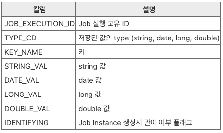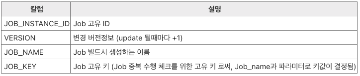 - job_key는 BATCH_JOB_EXECUTION_PARAMS에 저장되는 Parameter를 나열해 암호화해 저장한다.