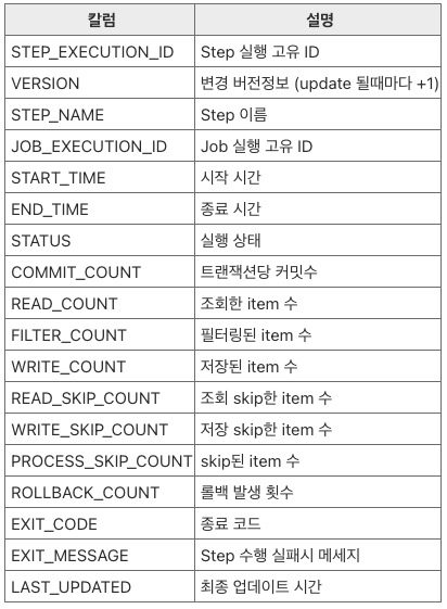 - 배치 Step의 실행정보를 담는 테이블이다.