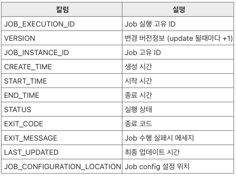 - 하나의 BATCH_JOB_INSTANCE는 N개의 BATCH_JOB_EXECUTION를 포함한다.