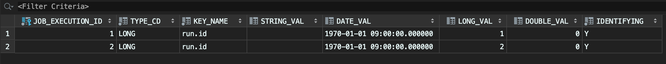 - job을 2번 실행하면 위와 같이 해당 job에 대한 정보가 BATCH_JOB_EXECUTION_CONTEXT에 저장된 것을 확인할 수 있다.
