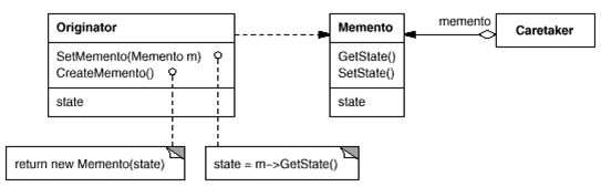 CareTaker (undo mechanism) : Memento의 보관을 책임지기는 하지만, memento의 내부를 확인할 수 없다.