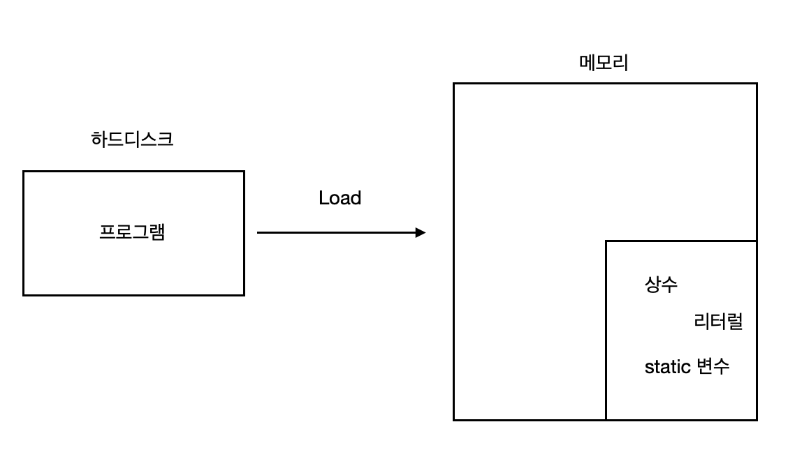 위와 같이 하드디스크에 있는 프로그램이 메모리로 로드될때, 상수, 리터럴, static변수 와같은 것들은 미리 메모리를 잡고 위치해있다.