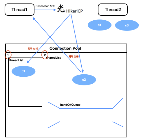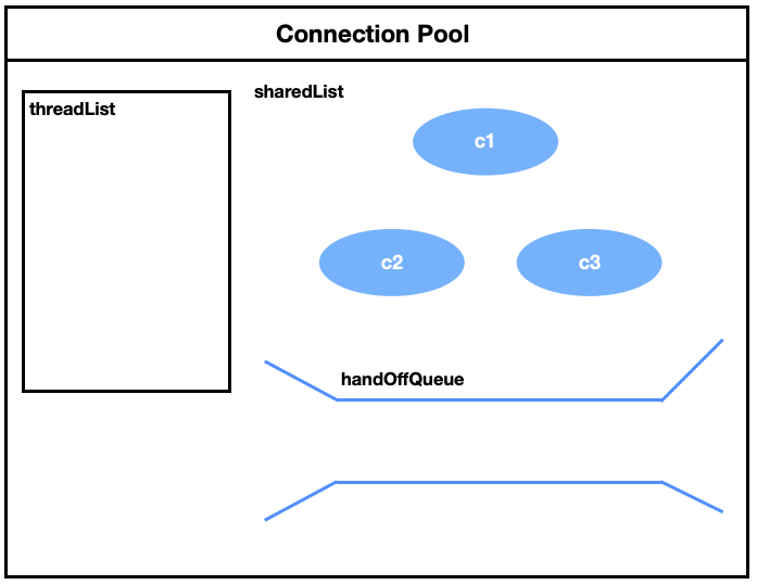 - handOffQueue: sharedList에 사용할 Connection이 없어서 Thread가 Connection을 기다릴 때 handOffQueue 앞에서 대기한다.