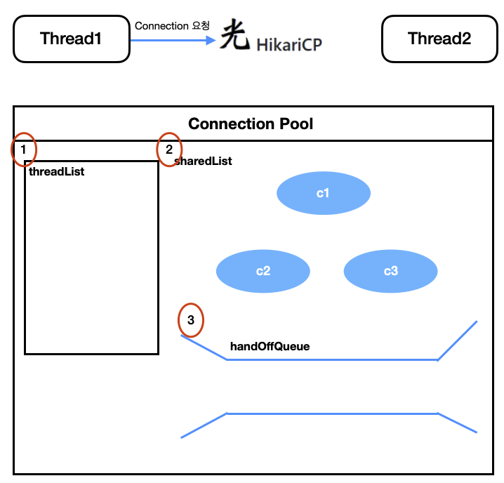- 1번 과정: 위와 같이 Thread가 Connection을 요청한다면 HikariCP는 먼저 ThreadList를 검사해서 해당 Thread가 사용했던 Connection 이력이 있다면, 해당 Connection을 먼저 전달해준다. (Connection 상태가 idle인 경우만 해당된다.)