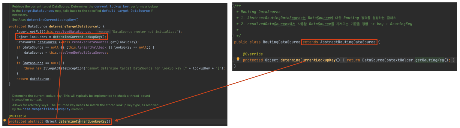 • AbstractRoutingDataSource의 determineCurrentLookupKey() 메서드를 오버라이드하면 된다.