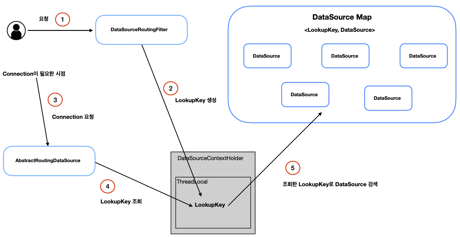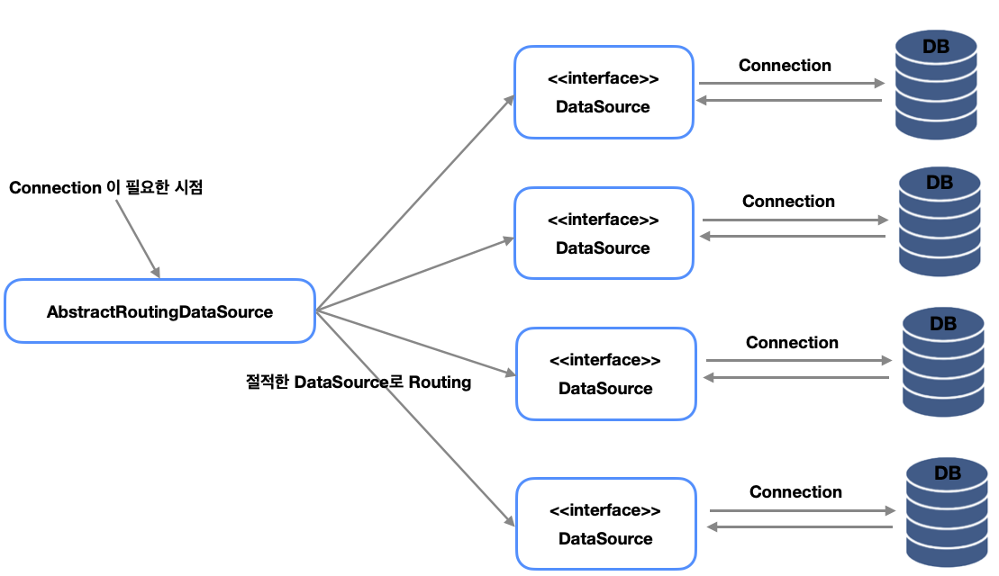 • AbstractRoutingDataSource는 아래 그림과 같이 Connection이 필요한 시점에 원하는 DataSource로 Routing해주는 DataSource의 구현체이다.