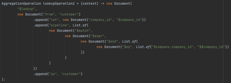 public AggregationOperation makeLookupOperation(String from, Document let, List<Document> match) {