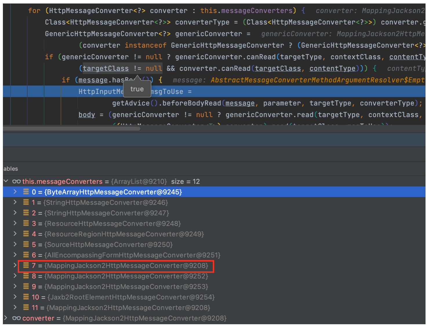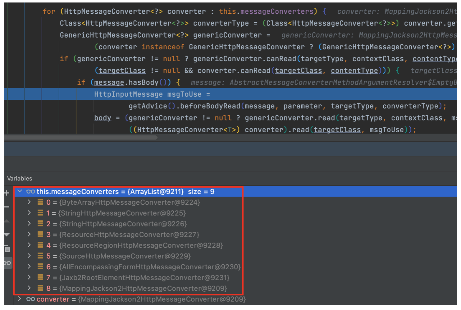 - 위에처럼 컨버터를 추가해 주고, AbstractMessageConverterMethodArgumentResolver.readWithMessageConverters()를 보면 아래와 같이 컨버터가 추가된 것을 확인할 수 있다.