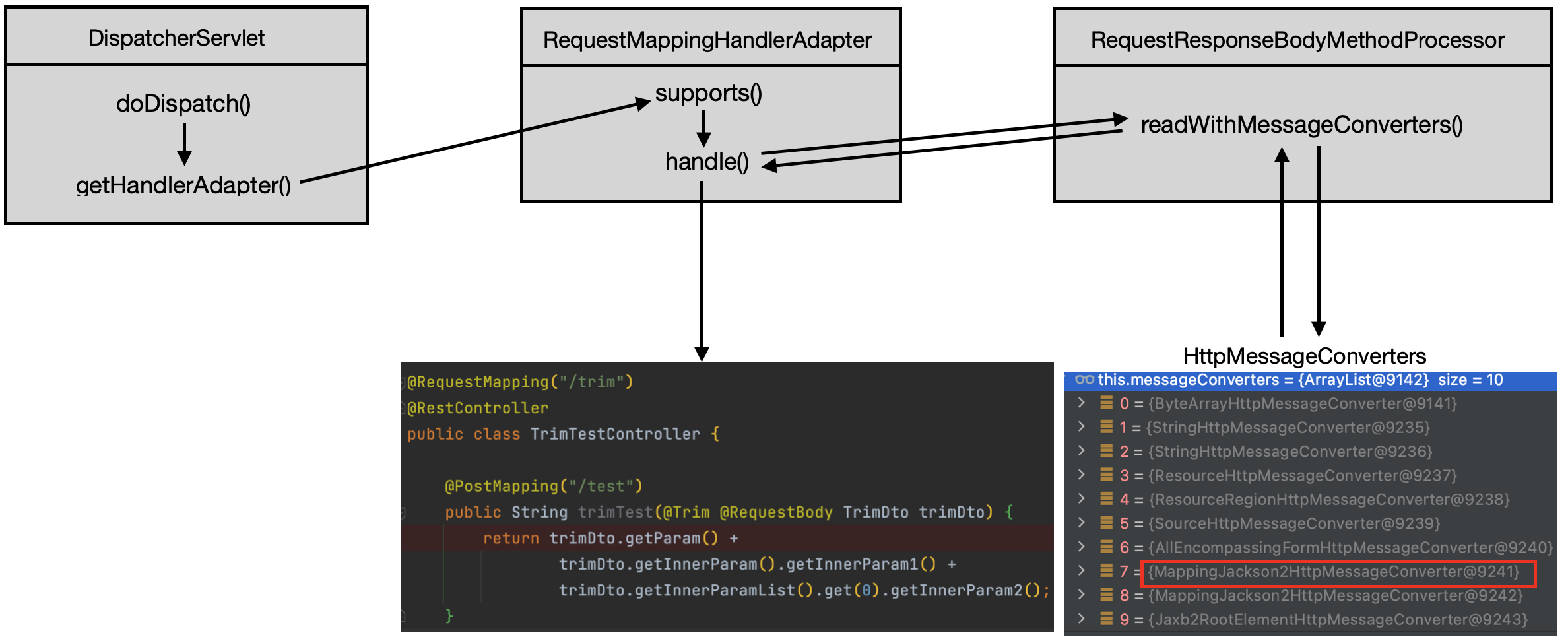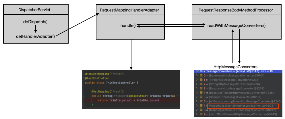 - 예를 들어, 요청의 content-type이 application/json이고 클래스 타입이 TrimDto(객체)인 경우 HttpMessageConverter 중에서 MappingJackson2HttpMessageConverter가 선택된다.