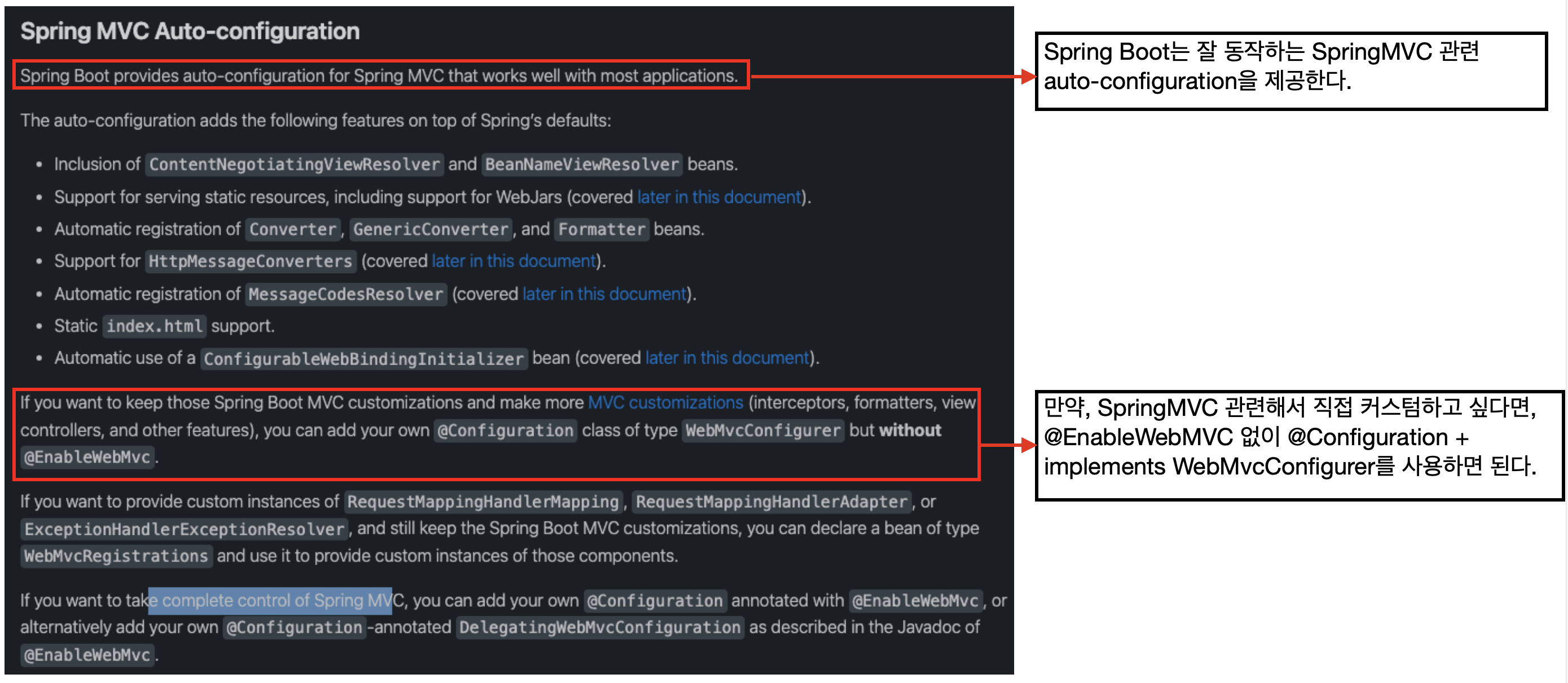 - 위의 내용을 정리하면, 스프링 부트가 제공하는 웹 MVC 관련 자동 설정을 유지하면서 커스터마이징하고 싶다면, @EnableWebMVC 없이 @Configuration + implements WebMvcConfigurer를 사용하면 된다고 나와있다.