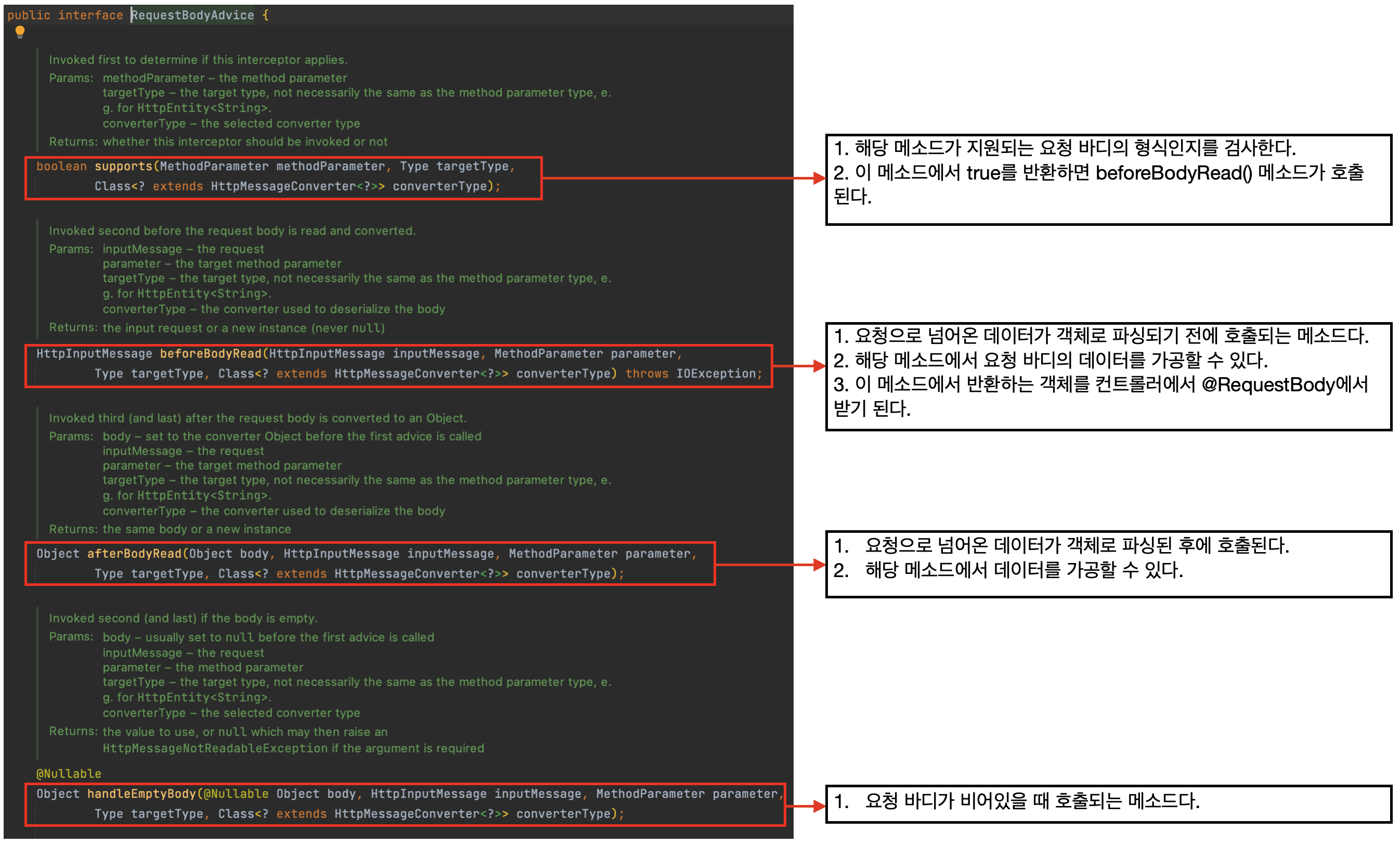 - RequestBodyAdvice를 구현하면 아래와 같은 4가지 메소드를 Override 할 수 있다.