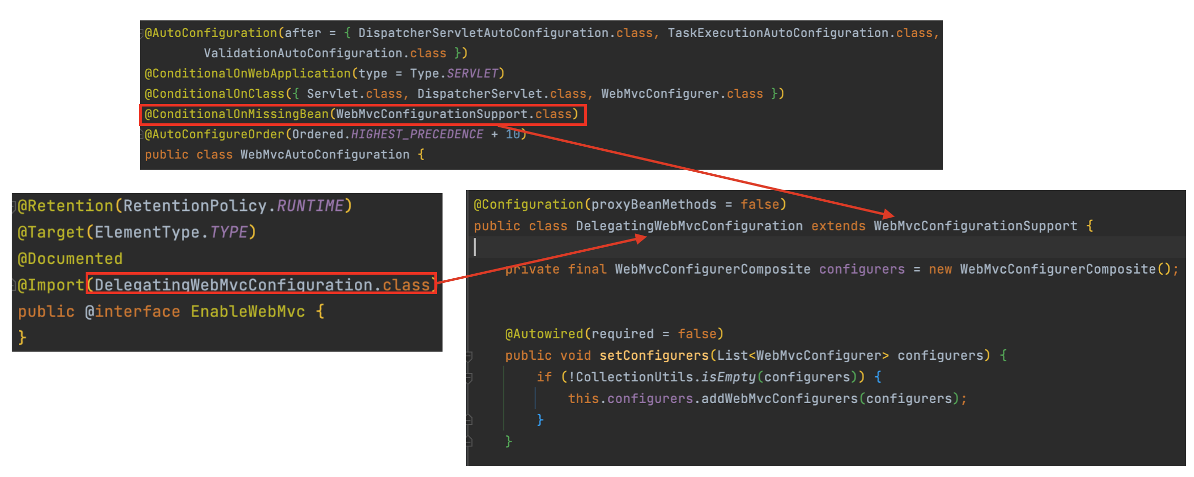 - 그렇기 때문에 @EnableWebMvc 애노테이션도 @Import(DelegatingWebMvcConfiguration.class)을 포함하고 있다.