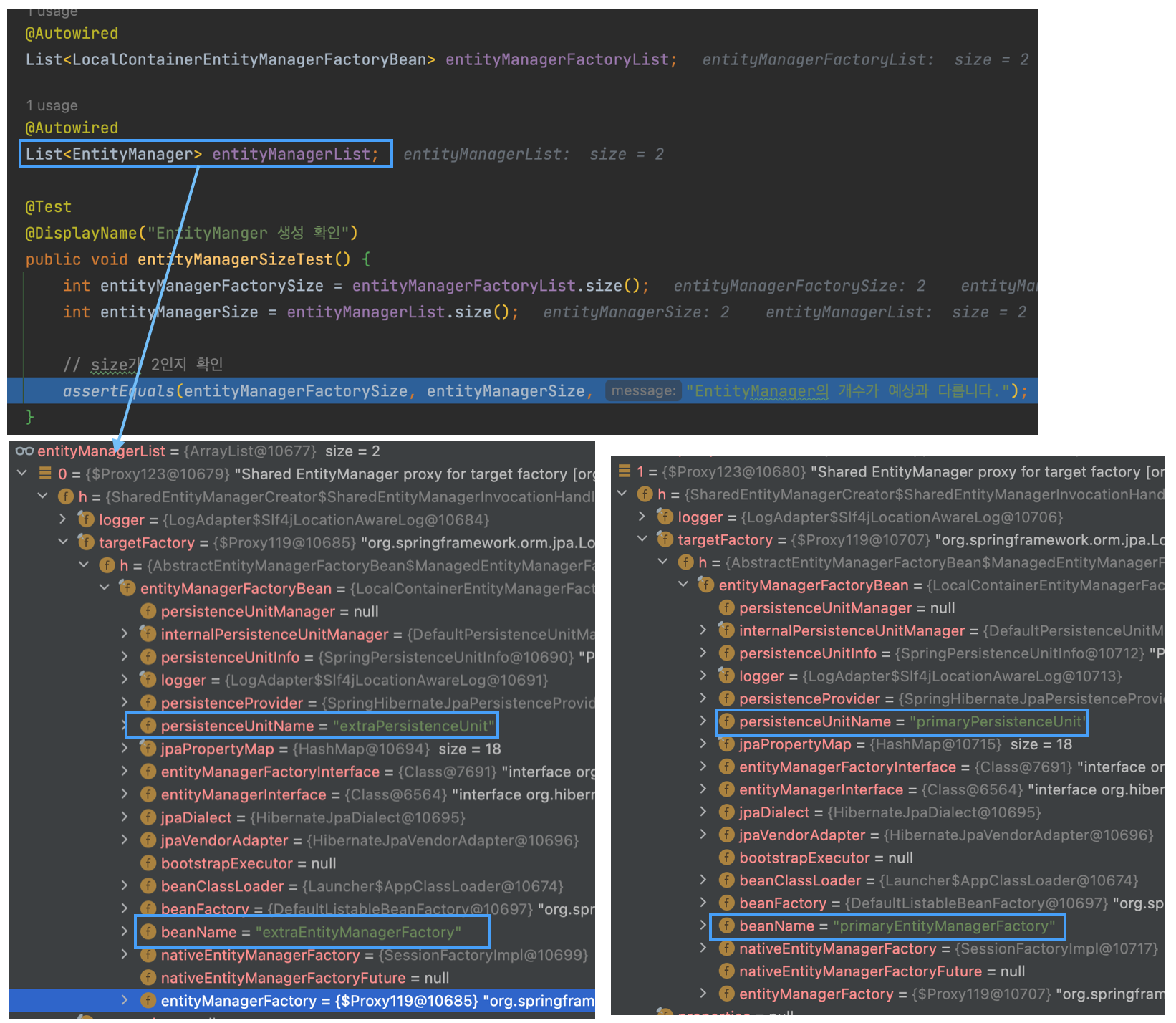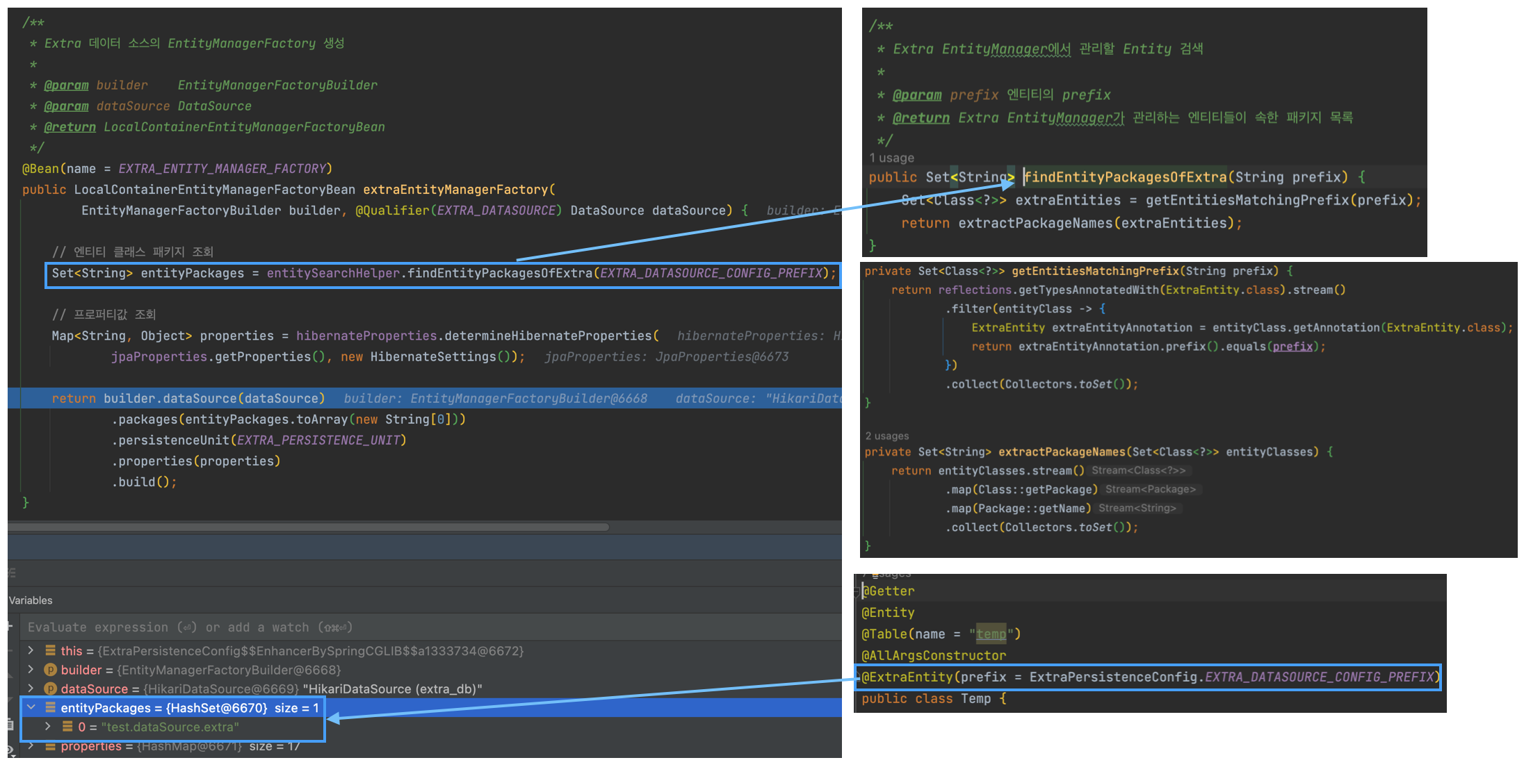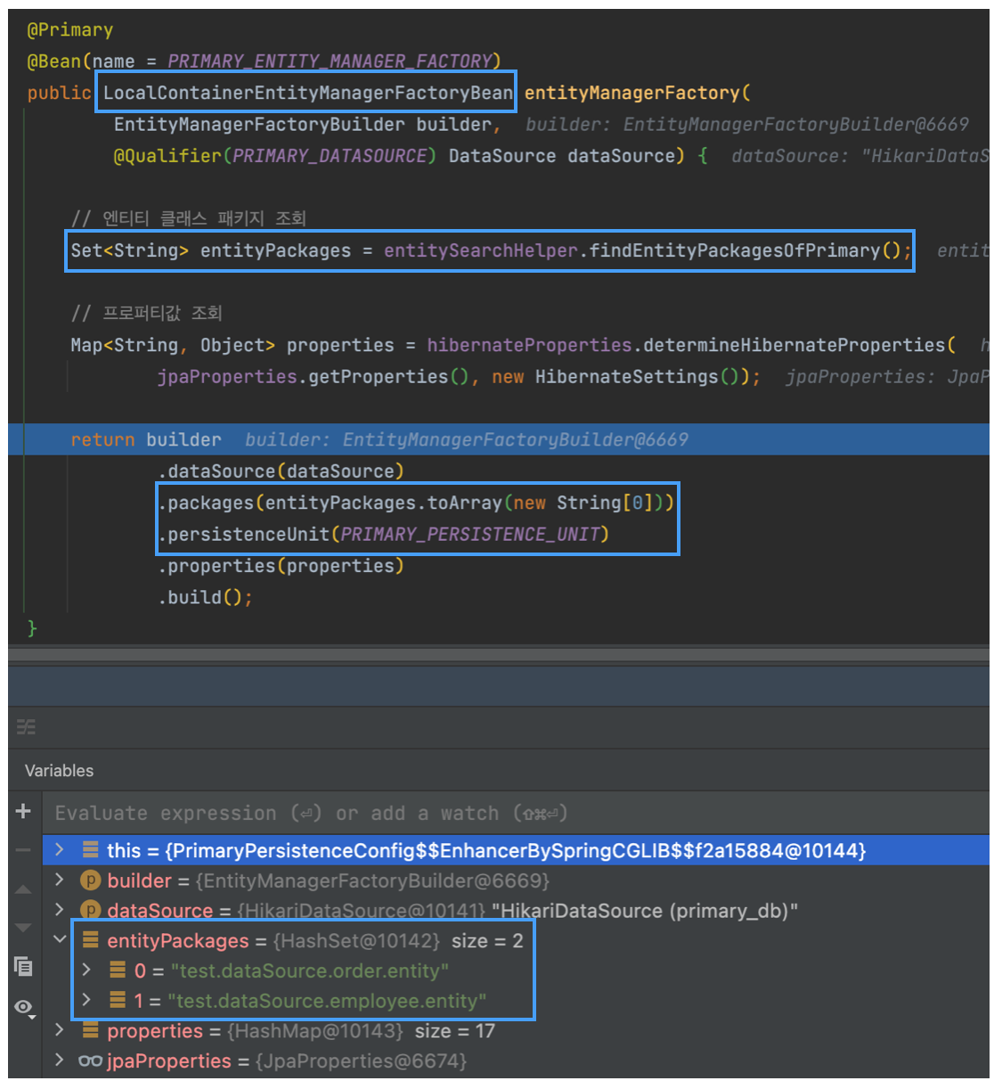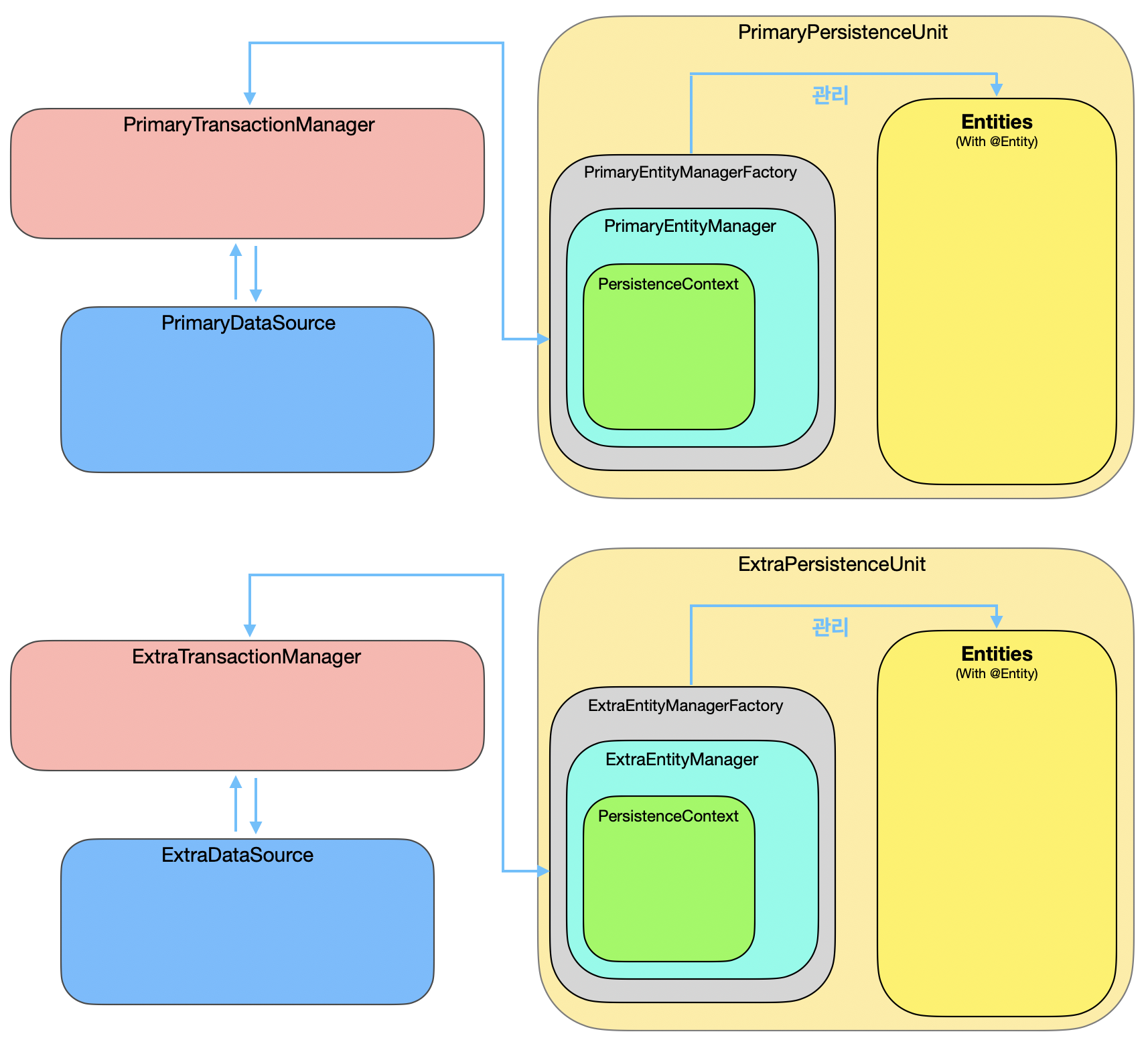 - 위와 같이, primary, extra 각각 PersistenceUnit, EntityManagerFactory, EntityManager, TransactionManager, DataSource를 구성해 줘야 한다.