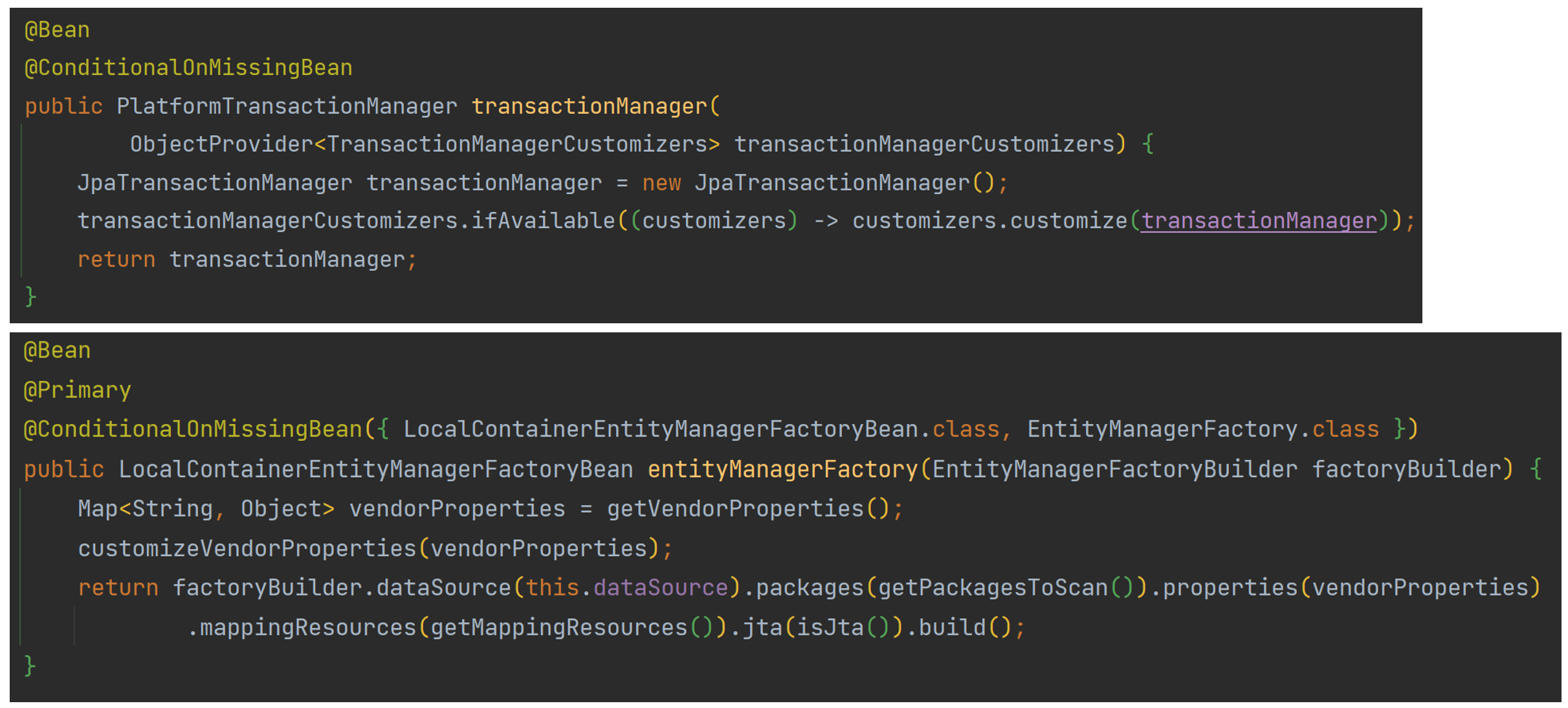 - 이전에 HibernateJpaConfiguration에 대해서 설명하면서 @ConditionalOnMissingBean 가 붙어있기 때문에, 개발자가 직접 EntityManagerFactory와 TransactionManager를 빈으로 등록한다면, 개발자가 등록한 빈이 우선권을 가진다고 언급했다.