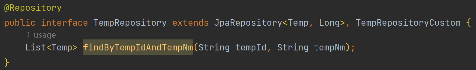 - 다시 말해, 개발자는 findByTempIdAndTempNm() 메소드만 정의하면, JpaRepositoriesAutoConfiguration의 자동설정을 통해서 JpaRepository의 구현체를 JPA에서 알아서 만들어주는 것이다.