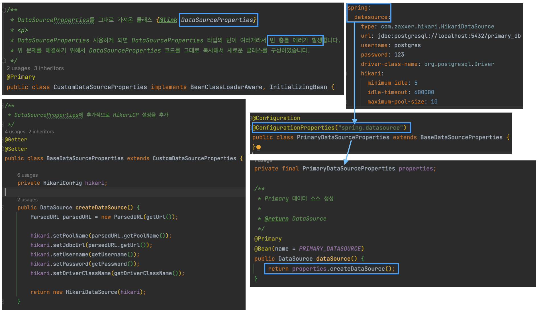 - 이 과정에서 DataSourceProperties를 직접 상속받으면 빈 충돌에러가 발생해서 DataSourceProperties 소스를 그대로 가져와서 CustomDataSourceProperties를 만들어서 사용했다.