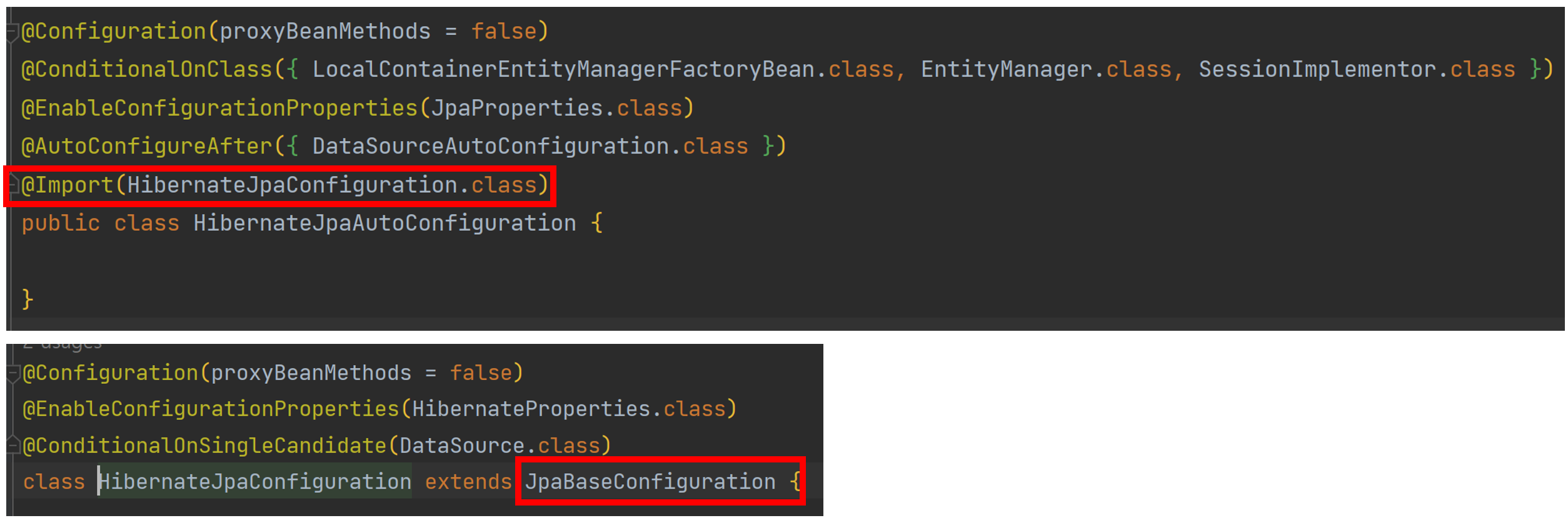 - @Import(HibernateJpaConfiguration.class)가 HibernateJpaConfiguration에서 가장 중요한 부부인데, @Import를 통해서 HibernateJpaConfiguration설정을 가져오고, HibernateJpaConfiguration는 JpaBaseConfiguration를 상속받고 있다.
