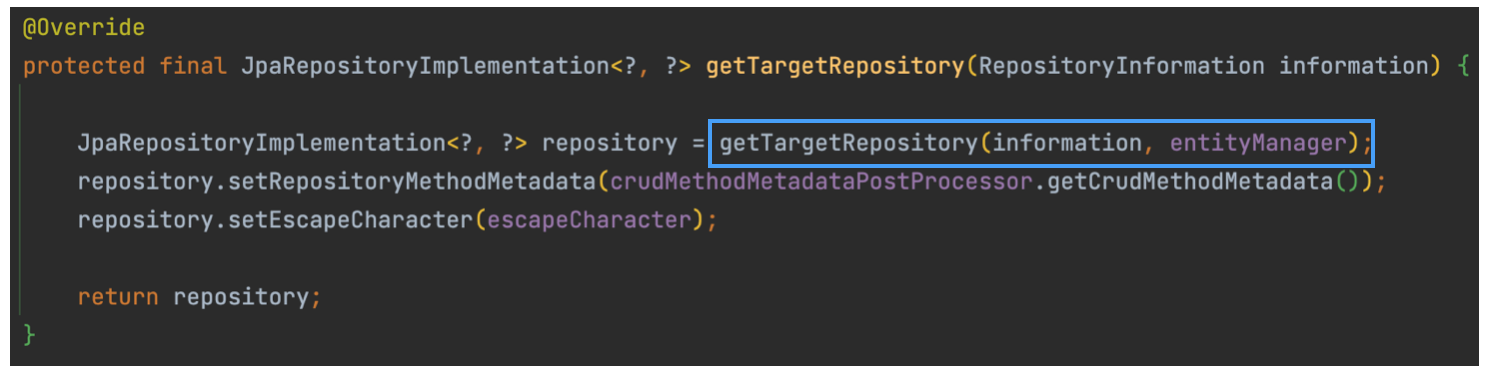 - 그다음, JpaRepositoryFactory의 getTargetRepositor() 메소드에서 JpaRepository에 대한 구현체를 만들어준다.