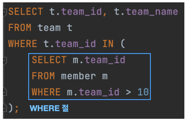 - WHERE절에 서브쿼리를 사용하는 형태가 실무에서 가장 자주 마주하는 형태일 것이다.