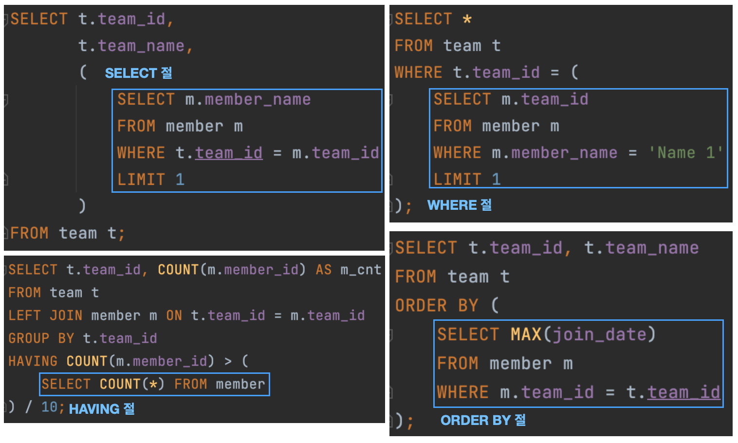 - 이 유형의 서브쿼리는 주로
