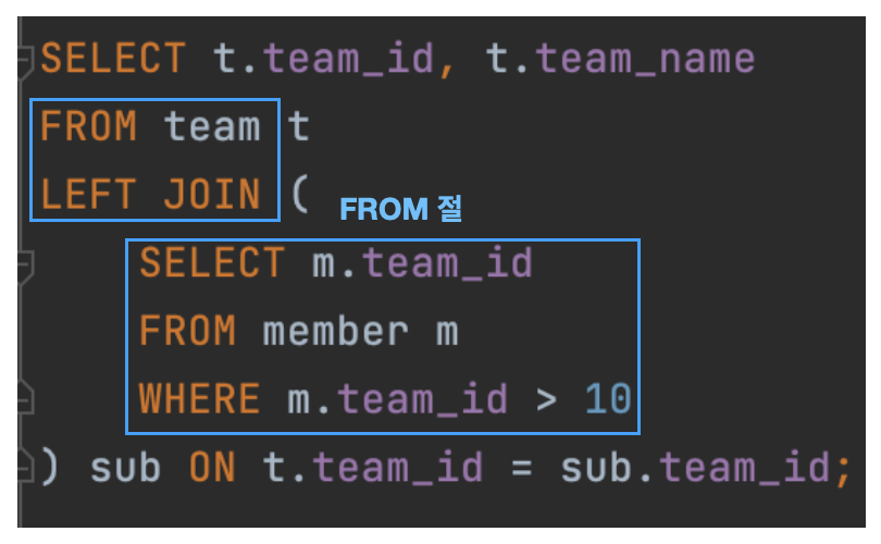FROM 절에서 사용된다. - 인라인 뷰는 결과 세트를 임시 테이블처럼 사용하여, 메인 쿼리에서 이를 참조하고 있다.