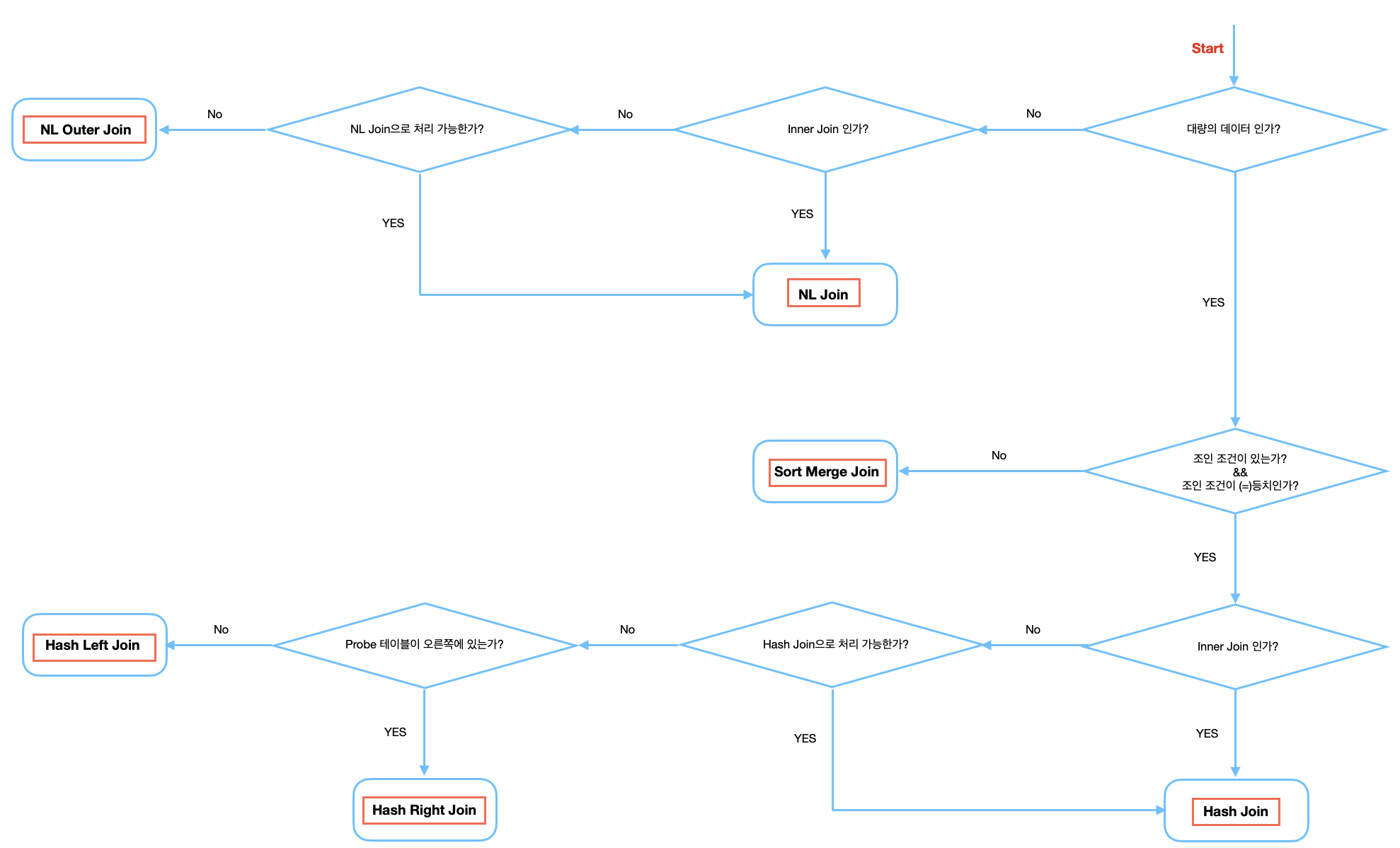 - 위에서 학습한 내용을 바탕으로 옵티마이저가 조인을 선택하는 기준을 도식화 하면 아래와 같다.물론, 옵티마이저의 판단 기준은 훨씬 복잡하기 때문에, 위의 조건대로 조인이 선택된다는 보장은 없다.