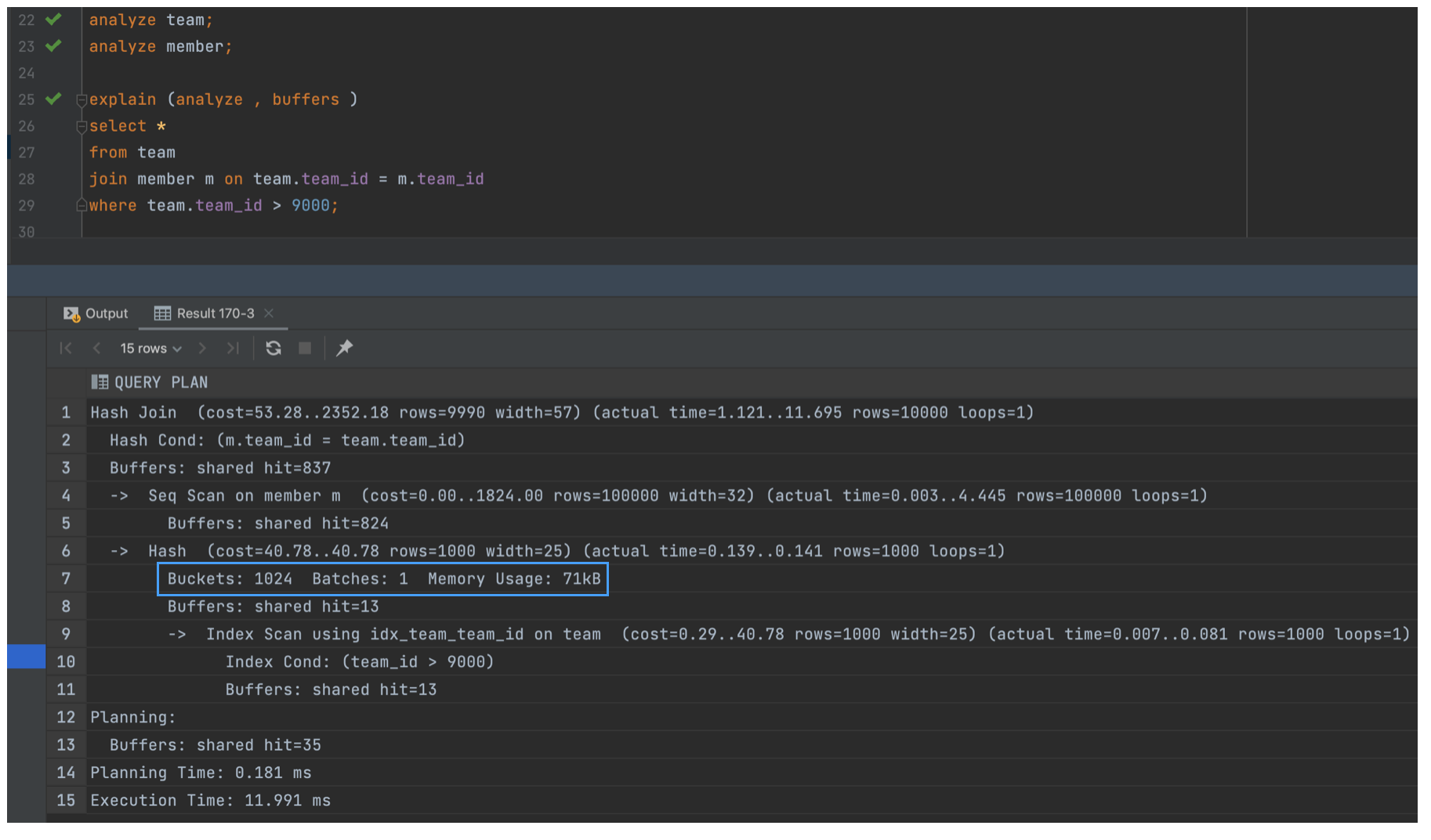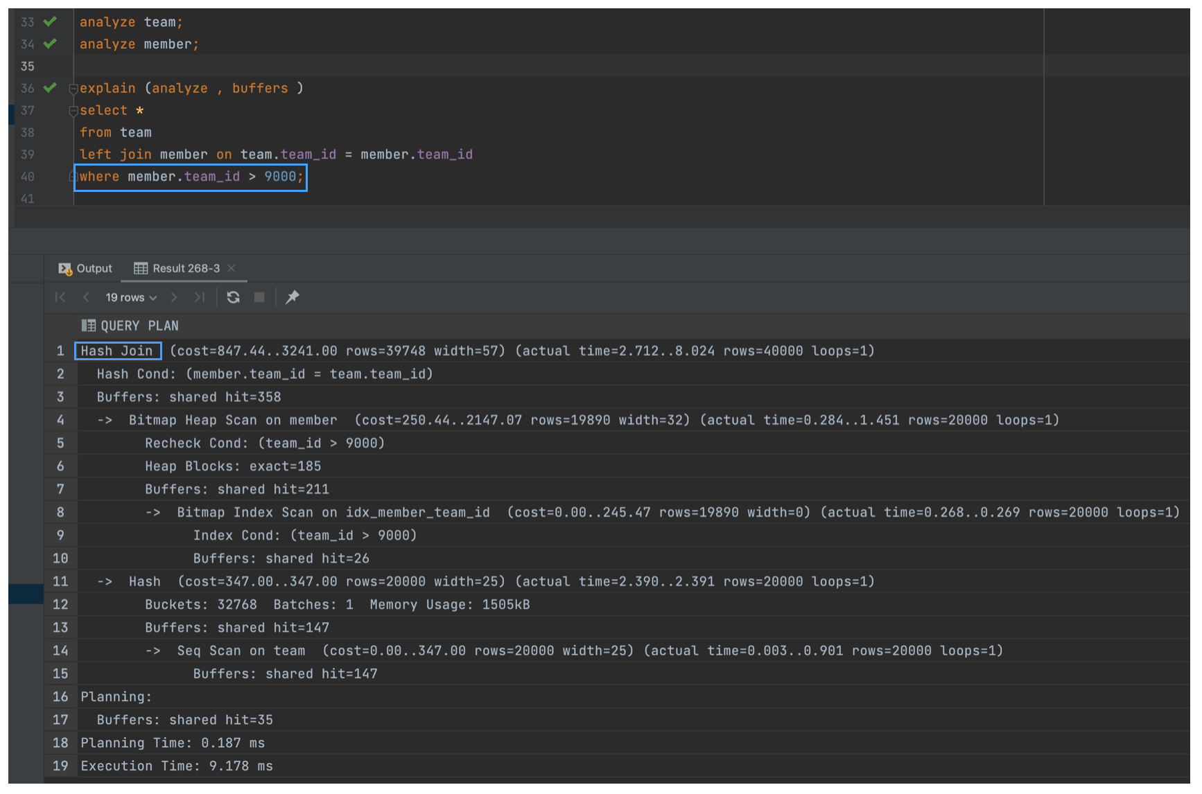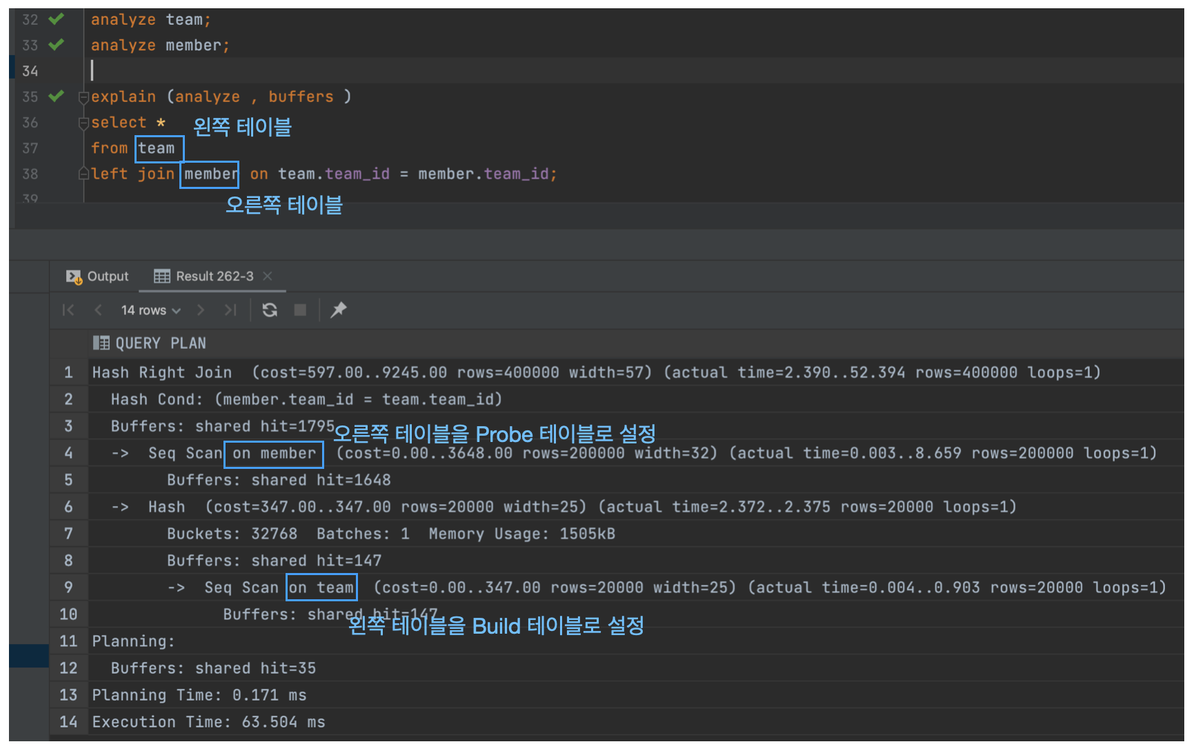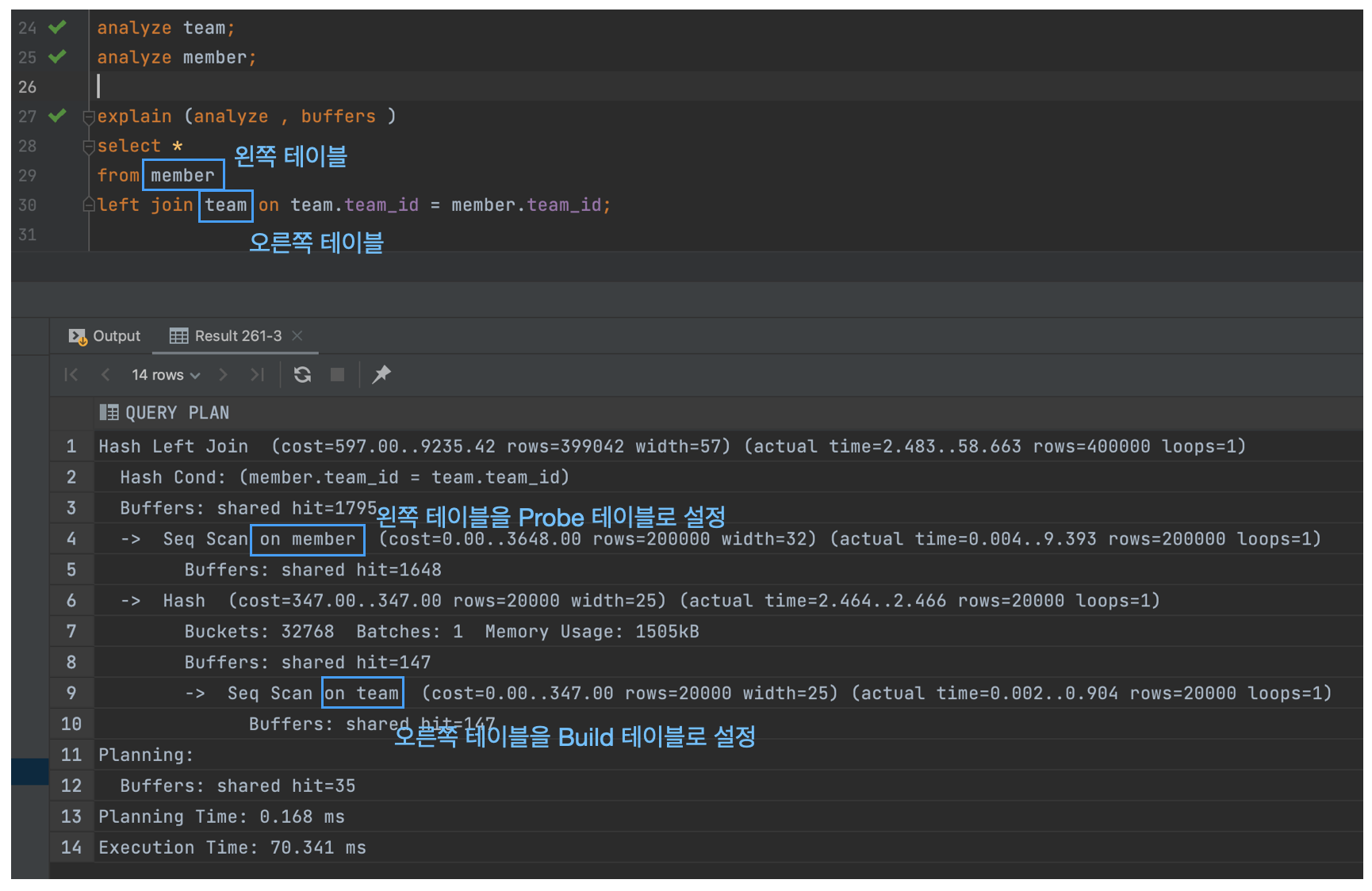 - team 테이블이 크기가 적기때문에 team이 Build Table이 되어야 하고, member가 Probe 테이블이 되어야한다.