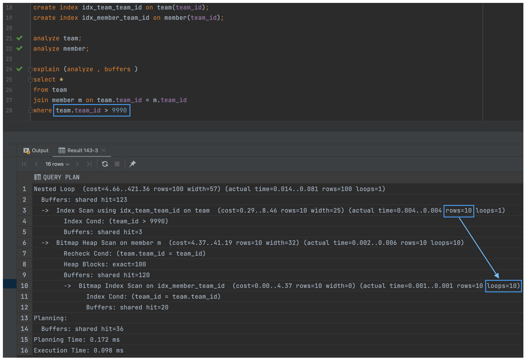 - NL 조인은 마치 2중 for 문과 같다고 했다. 따라서 team 에서 10건이 반환됐다면, 그 다음 테이블은 member 테이블의 loops는 10이 될 것이다.