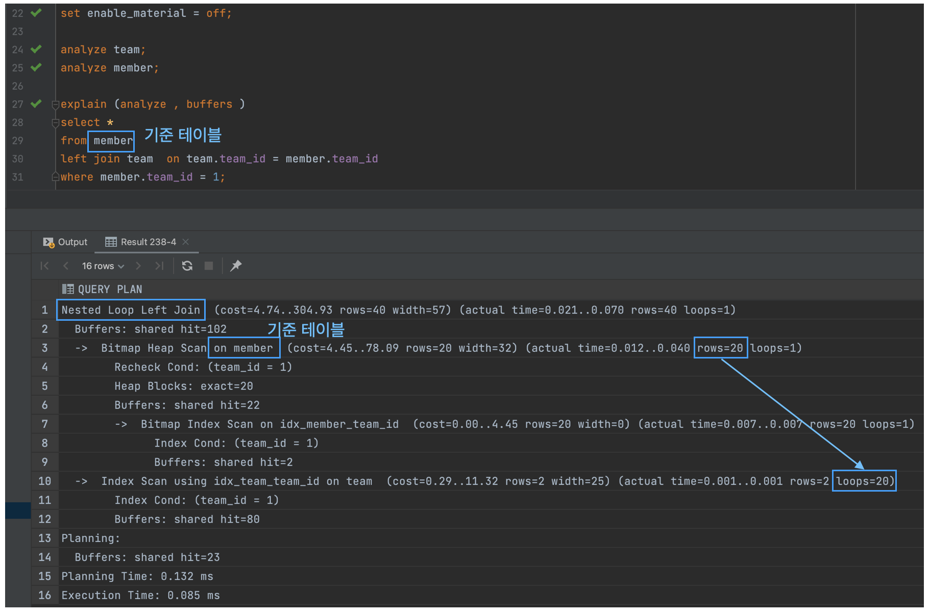 - 따라서 왼쪽에 있는 member 테이블을 Probe가 되는 Hash Left Join이 선택된다.