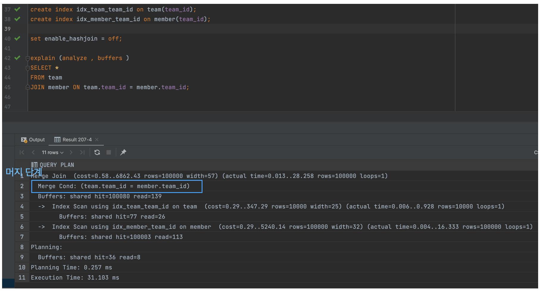 - 이미 정렬된 데이터에 대해서 Merge Join 이 선택될 확률이 높다.