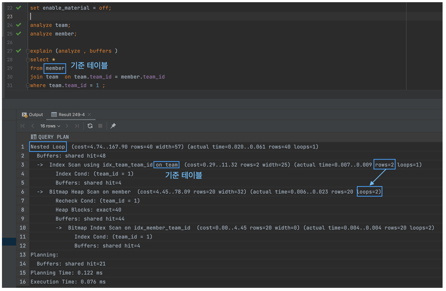 SET enable_material = OFF를 설정했다. - 위 실행계획에서 볼 수 있듯이, NL Join의 경우에 team, member 중에서 크기가 작은 team을 기준테이블로 선정한 것을 확인할 수 있다.