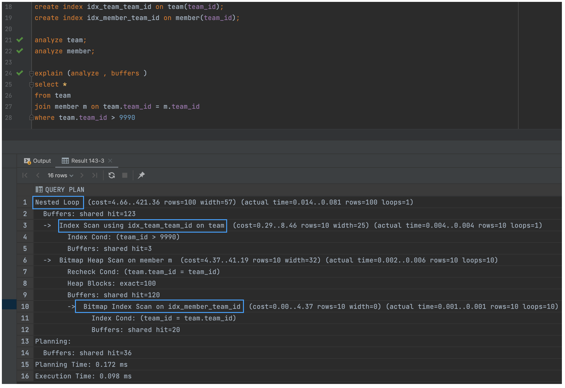 - 또한, 두 테이블을 탐색하는 과정에서 인덱스를 활용한 것도 알 수 있다.
