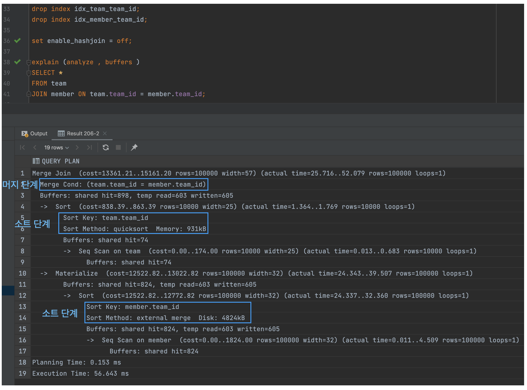 set enable_hashjoin = off;을 통해서 Merge Join을 유도했다. - 정렬이 안되어 있기 때문에, 사전 정렬 단계를 거쳐서 머지하고 있는 것을 확인할 수 있다.