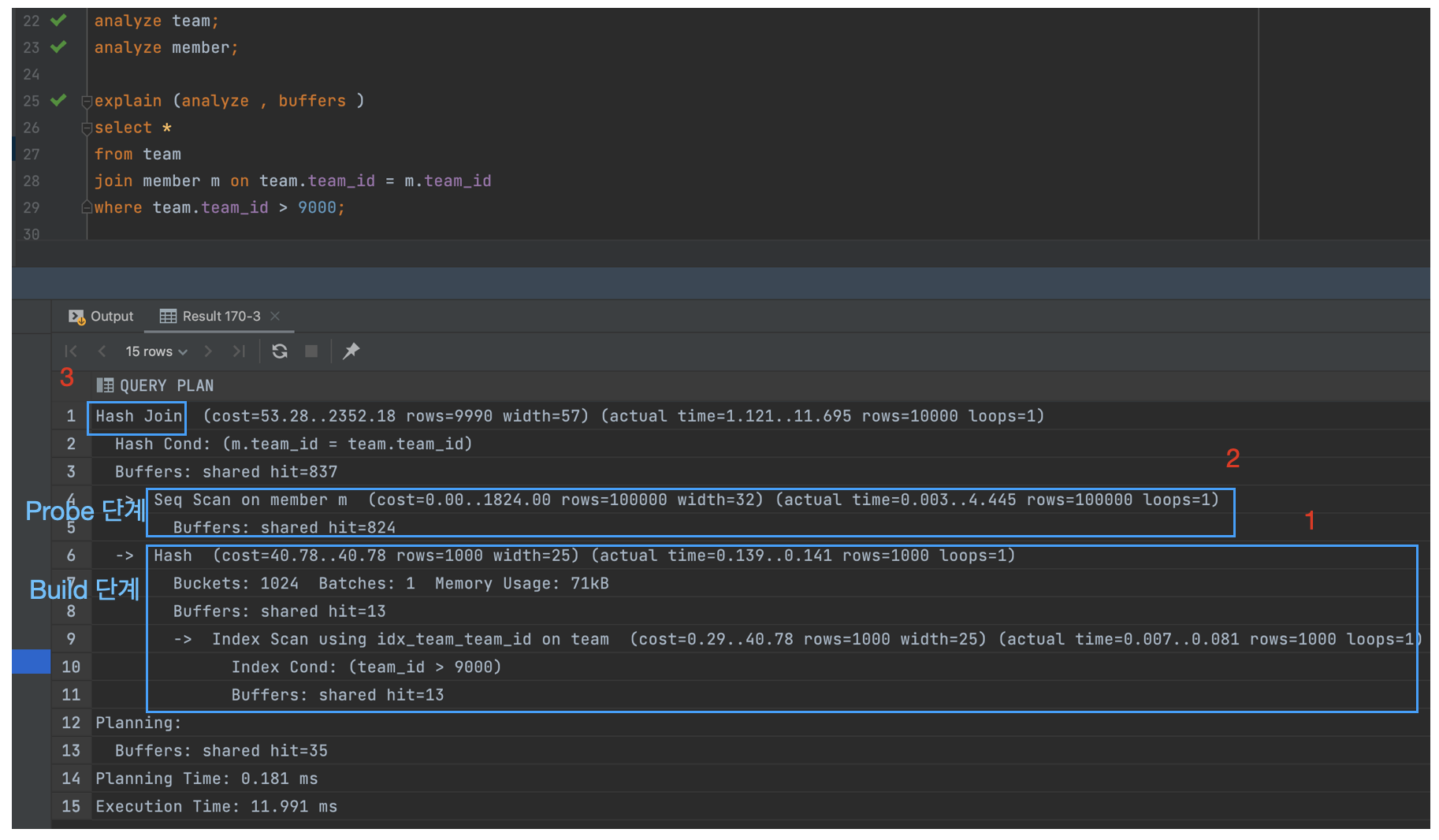 - team 테이블이 크기가 적기때문에 team이 Build Table이 되어야 하고, member가 Probe 테이블이 되어야한다.