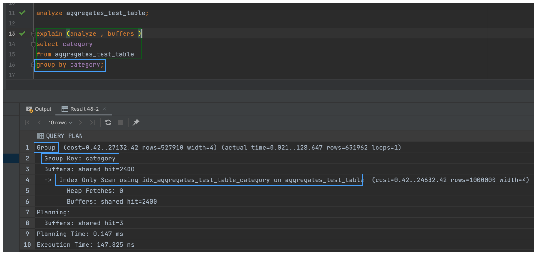 인덱스가 있고 데이터의 크기가 100만 건으로 상당히 크기 때문에 옵티마이저는 HashAggregate 대신 GroupAggregate를 선택했다.