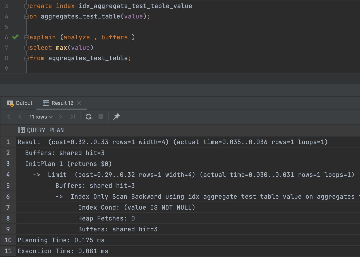 위와 같이 Aggregate 오퍼레이션을 통해서 aggregate_test_table을 Seq Scan으로 Full Scan해서 max값을 찾고 있다.
